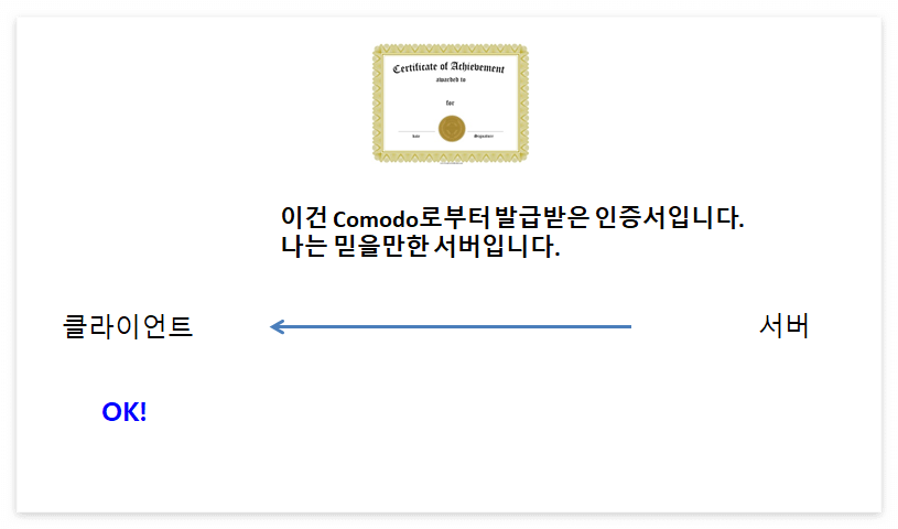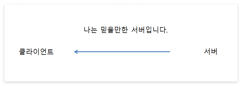 서버가 클라이언트에게 "나는 믿을만한 서버야"라고 이야기하고 있습니다.